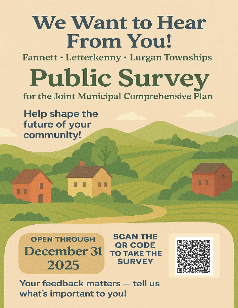 Fannett, Letterkenny and Lurgan Townships are currently updating their joint municipal comprehensive plan for purposes of planning for the region’s future. As part of this process the Township is seeking the public’s input on a variety of issues. Please consider filling out the survey at the following link and providing your opinions. Your participation matters and is greatly appreciated. The survey closes on December 31st. We invite you to help shape our future